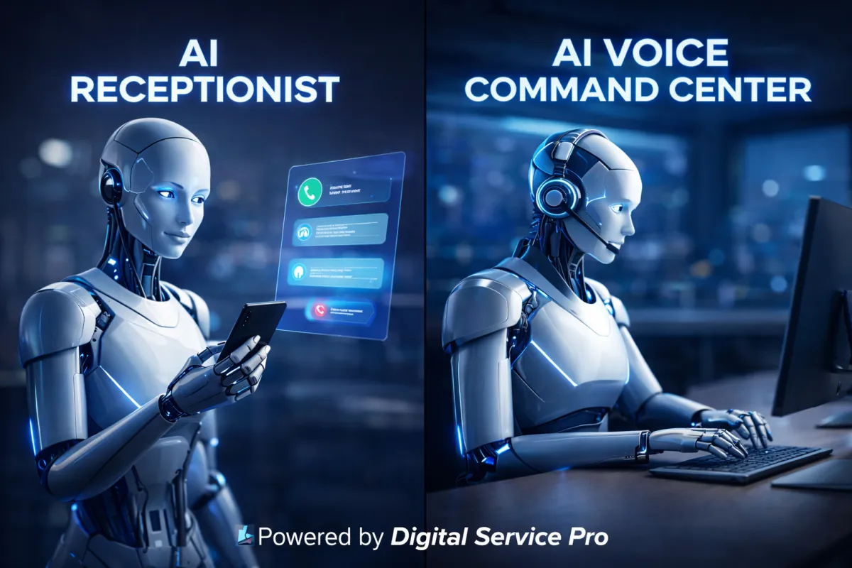 Digital Service Pro delivers two powerful solutions — the AI Voice Command Center and the AI Receptionist — designed for new and established businesses alike. Together, they help generate leads, nurture customer relationships, manage social media, create marketing campaigns, send email and SMS communications, and handle incoming calls — all within one streamlined system.